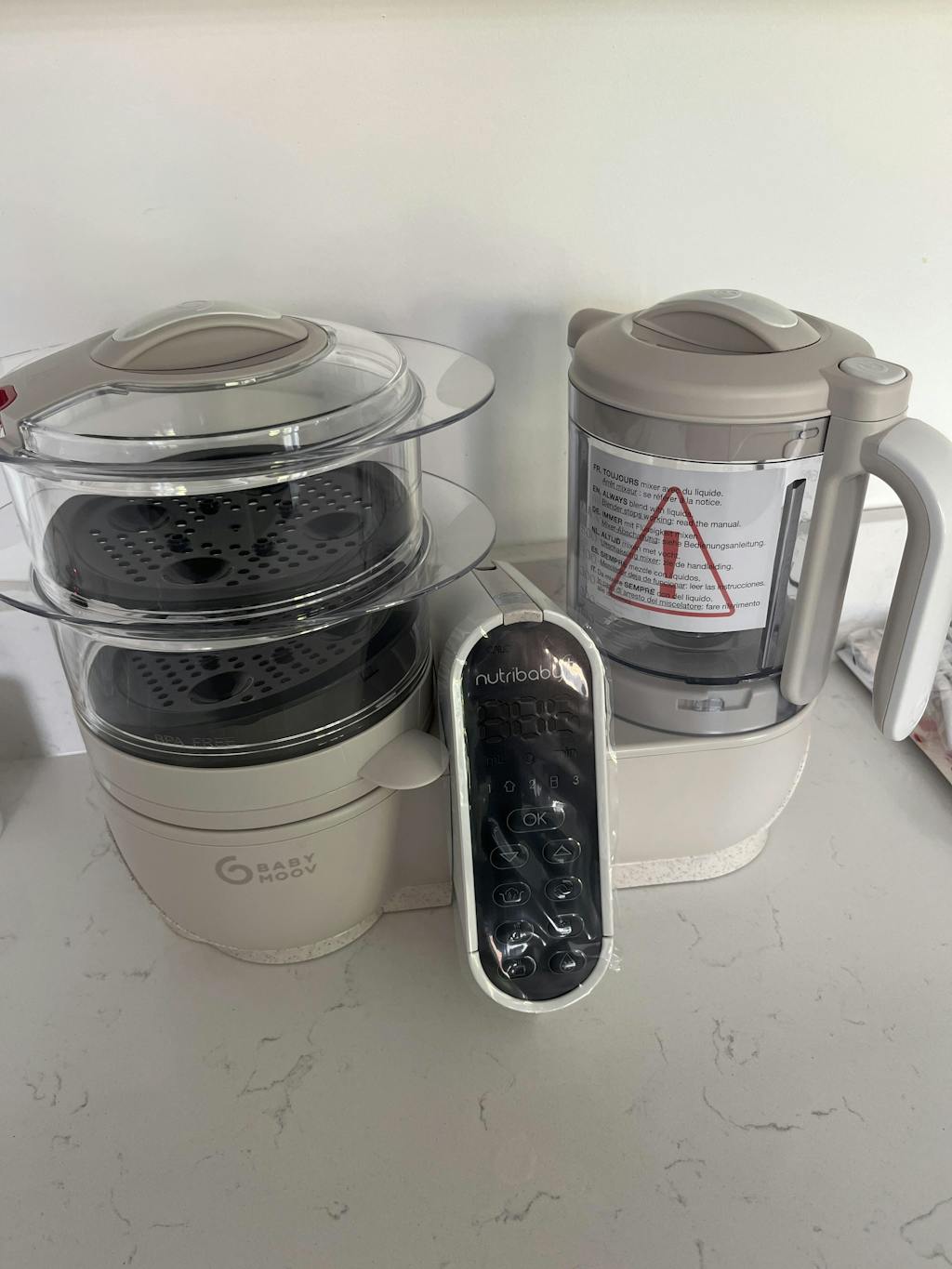 - Nutribaby+ Grey is the multifunctional food prep maker including steaming, blending, sterilising bottles and small accessories, reheating (food jars + baby bottles) and defrosting.